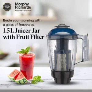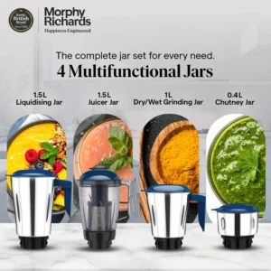 - ৩টি উচ্চ-গ্রেড স্টেইনলেস-স্টিলের জার – ১.৫ লিটার লিকুইডাইজিং জার + ১ লিটার শুকনো/ভেজা গ্রাইন্ডিং জার + ০.৪ লিটার চাটনি জার + ১.৭ লিটার জুসার জার ফলের ফিল্টার সহ